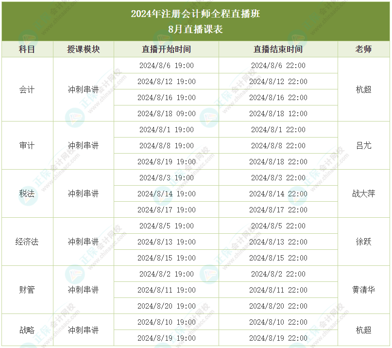 2024年注册会计师考试于8月下旬进行,距离考试仅剩1个月时间,同学们学习进度如何?注会全程直播班8月进入“冲刺串讲”课程阶段,主要进行重难点复习、提示,查漏补缺及时巩固薄弱点。