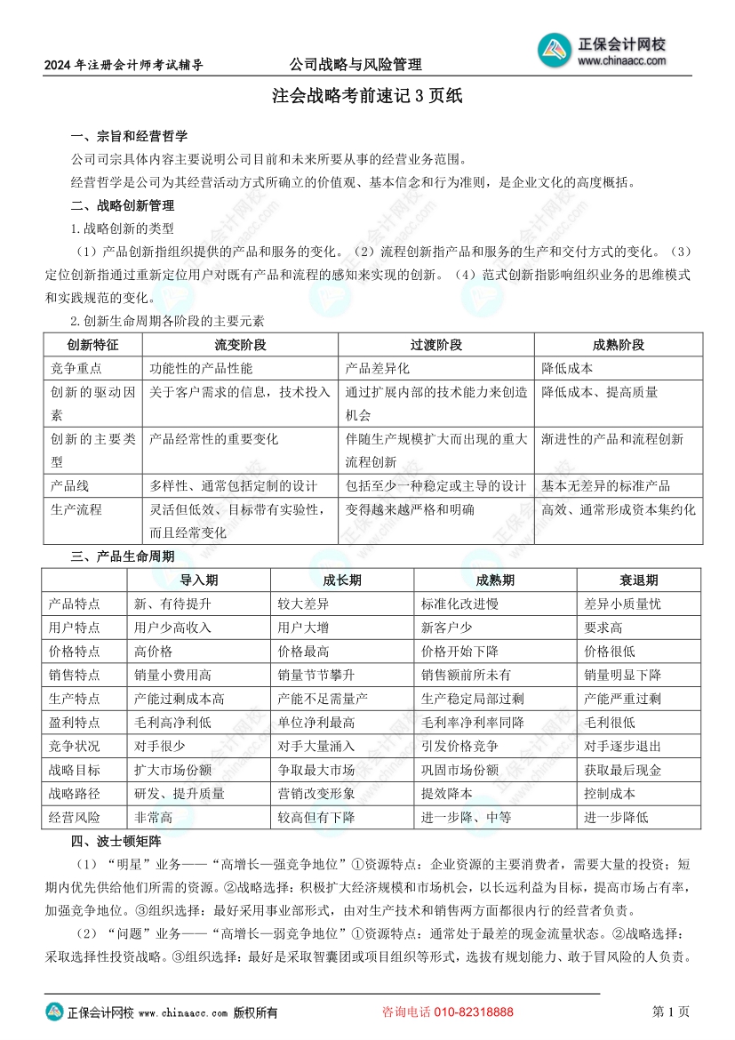 2024年注册会计师考试8月23日即将开始,大家准备的怎么样啦?考前福利来咯!正保会计网校教研团队为助力大家更充分的迎战注会,总结了以下这份《公司战略与风险管理》考前速记三页纸!进考场前再看一眼,或许就拿捏了呢!