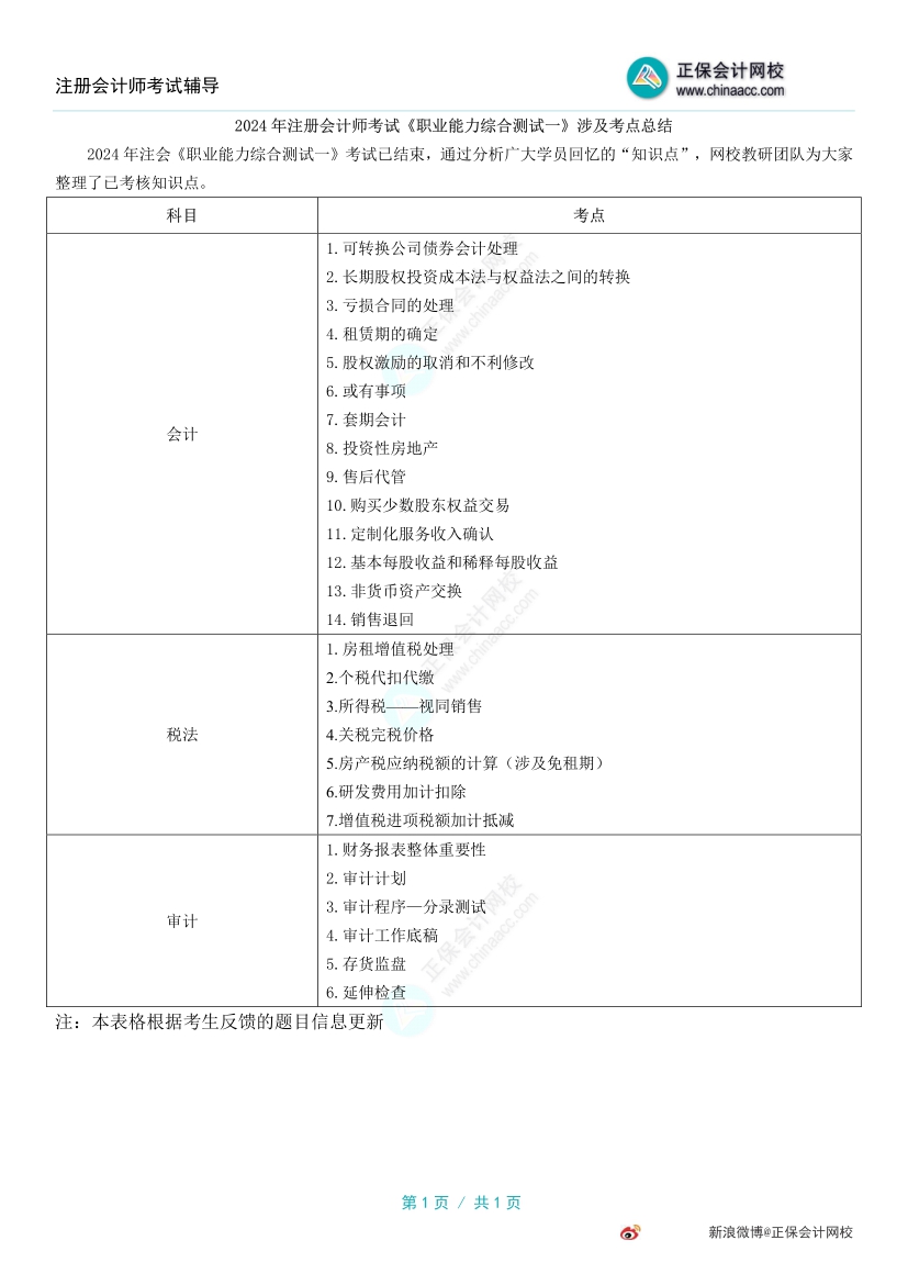 2024年注会考试已经结束,不少考生参加综合阶段考试,也已经走出考场,还记得考试情况吗?都考到哪些知识点了呢?2024年注册会计师职业能力综合测试(试卷一)考试涉及考点总结来啦~