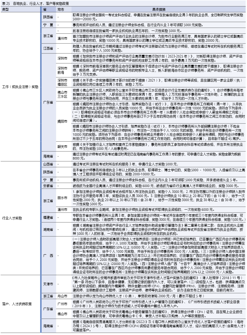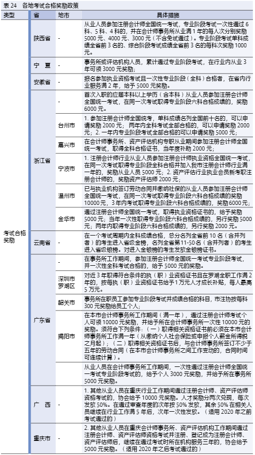 为吸引激励更多优秀的专业人才加入行业,助力行业高质量发展,各省(自治区、直辖市)纷纷实行了不同形式的考试合格奖励政策,包括执业奖励、人才奖励、落户、人才扶持,以及与会计职称对接政策等。