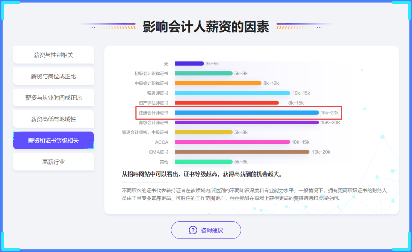 根据网校调查问卷考生的反馈可知,影响会计人薪资的因素较多,比如,性别、岗位、从业时间、地域、证书等级、从事行业等。从证书等级上来看,拥有注册会计师证书人员薪资水平在15K-20k的范围,CPA证书可谓涨薪神器!如果你也是会计人,期望拿高薪,不妨提早布局,考下注册会计师证书!