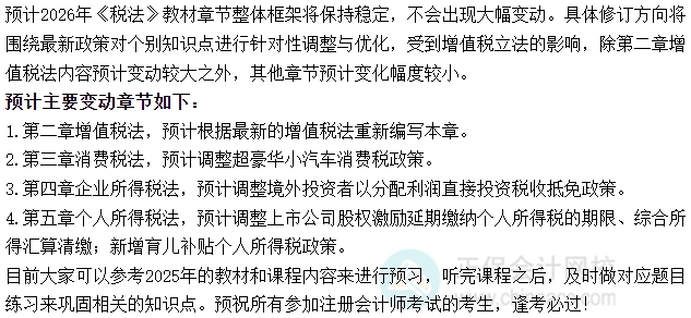 2026年注册会计师备考已经开始了,为帮助大家提前备考,掌握备考方向,正保会计网校教研老师为大家预测整理了2026年注册会计师《税法》教材变动预测及备考建议,希望对各位考生在备考时产生帮助。