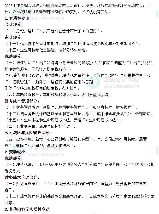 2026年注册会计师考试大纲现已重磅公布!不少考生都在关心,2026年注会综合阶段考试大纲和 2025年相比,变化大不大呢?别着急!正保会计网校已经针对新旧注会考试大纲展开了全面且细致的对比分析,帮你快速梳理,轻松 get 变化要点,备考不迷茫 !