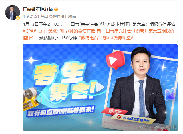 注会er!4月13日下午2:00 ,姚军胜老师将通过微博直播的方式,“一口气”串完注会《财务成本管理》第六章:期权价值评估,预估时间:150分钟,没学明白的小伙伴,快来!
