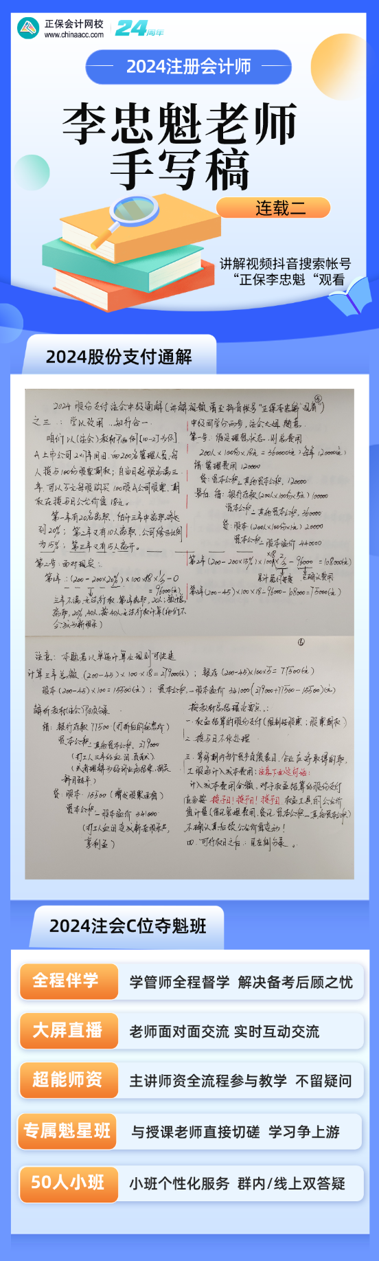 2024年注册会计师备考进行中,大家的学习进度都到哪里了呢?李忠魁老师给我们准备了2024年注会股份支付通解的手写稿,一起来看看吧!