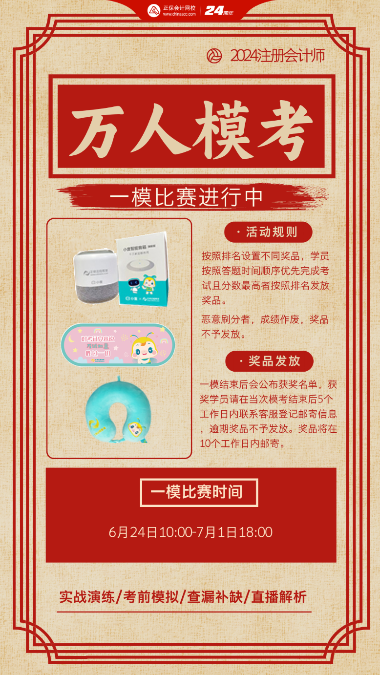 2024年注册会计师万人模考一模比赛进行中,不仅可以免费做题还有奖品拿?是的,你没有看错!正保联名款小度智能音箱、U型枕、万试如意”鼠标垫等奖品免费赠!还没有参加比赛的你,快来做题检验学习效果啦~进入万人模考大赛>>