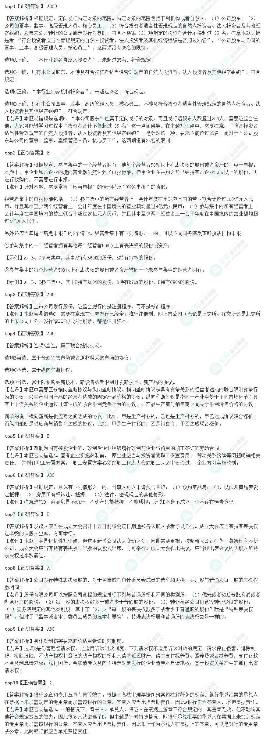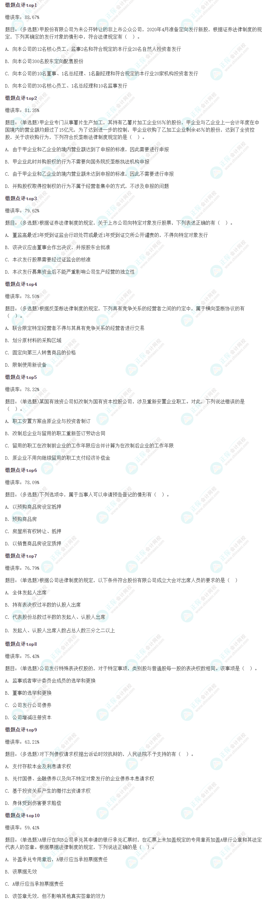 以下为根据考生答题情况整理出的注会《经济法》模考错题率Top10的题目: