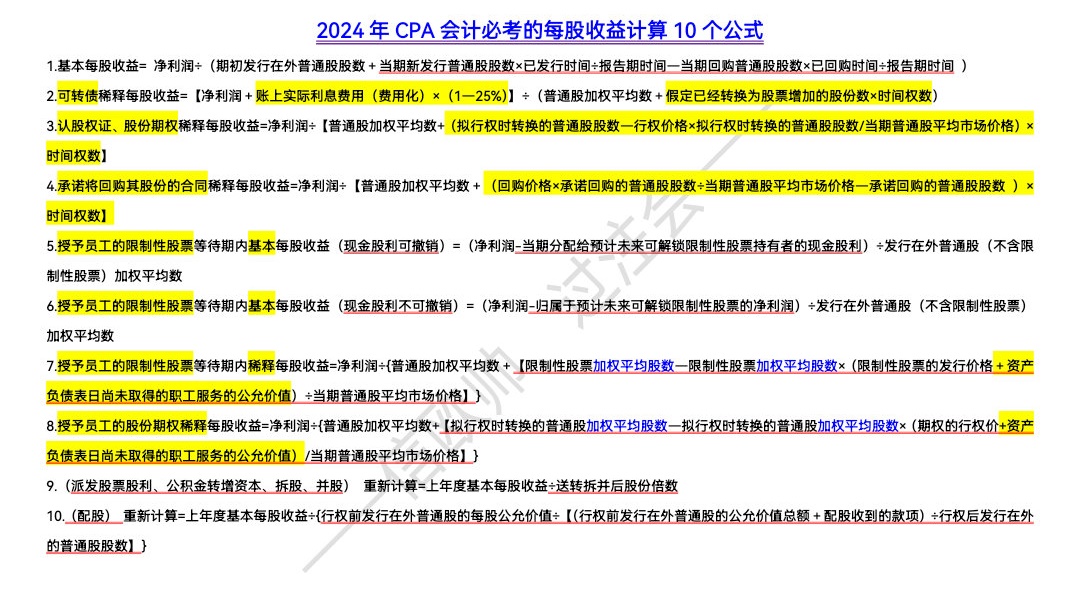 临近注会考试你是否也面临着公式记不住的局面?为了帮助大家更好的理解和记忆,欧理平老师帮我们整理了CPA考试必考的每股收益计算公式,快看都有哪些吧!