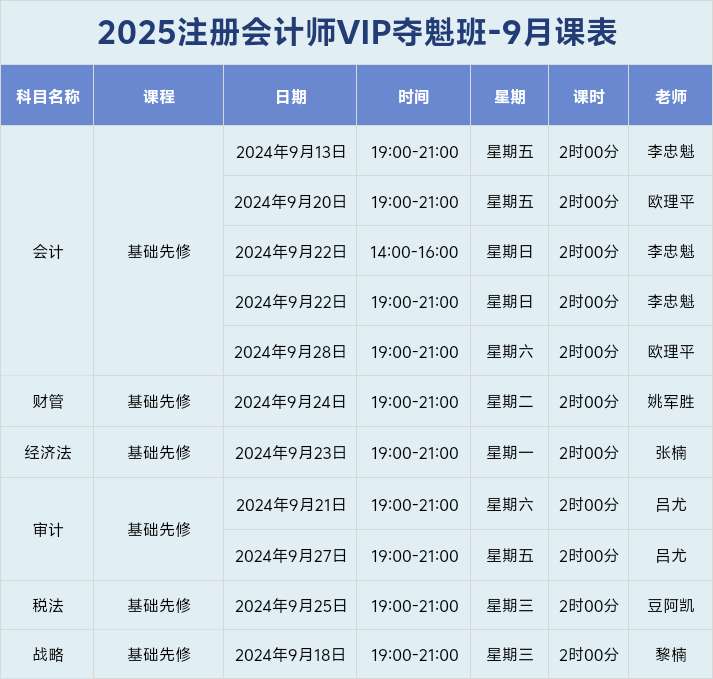 抢先备考!2025年注册会计师VIP夺魁班9月课表已公布!备考学习自制力差、基础薄弱或想听直播课的各位同学,快来!!!