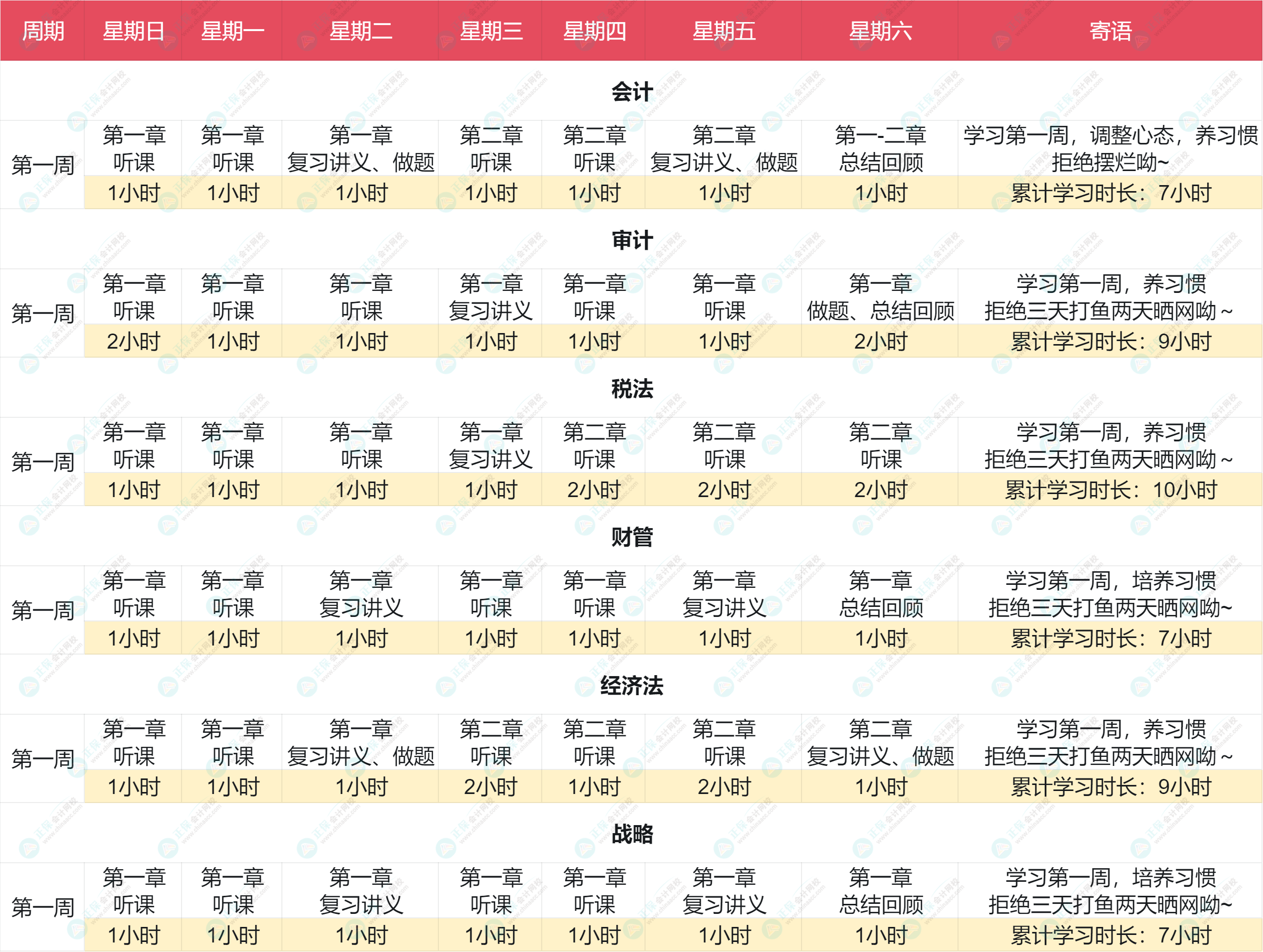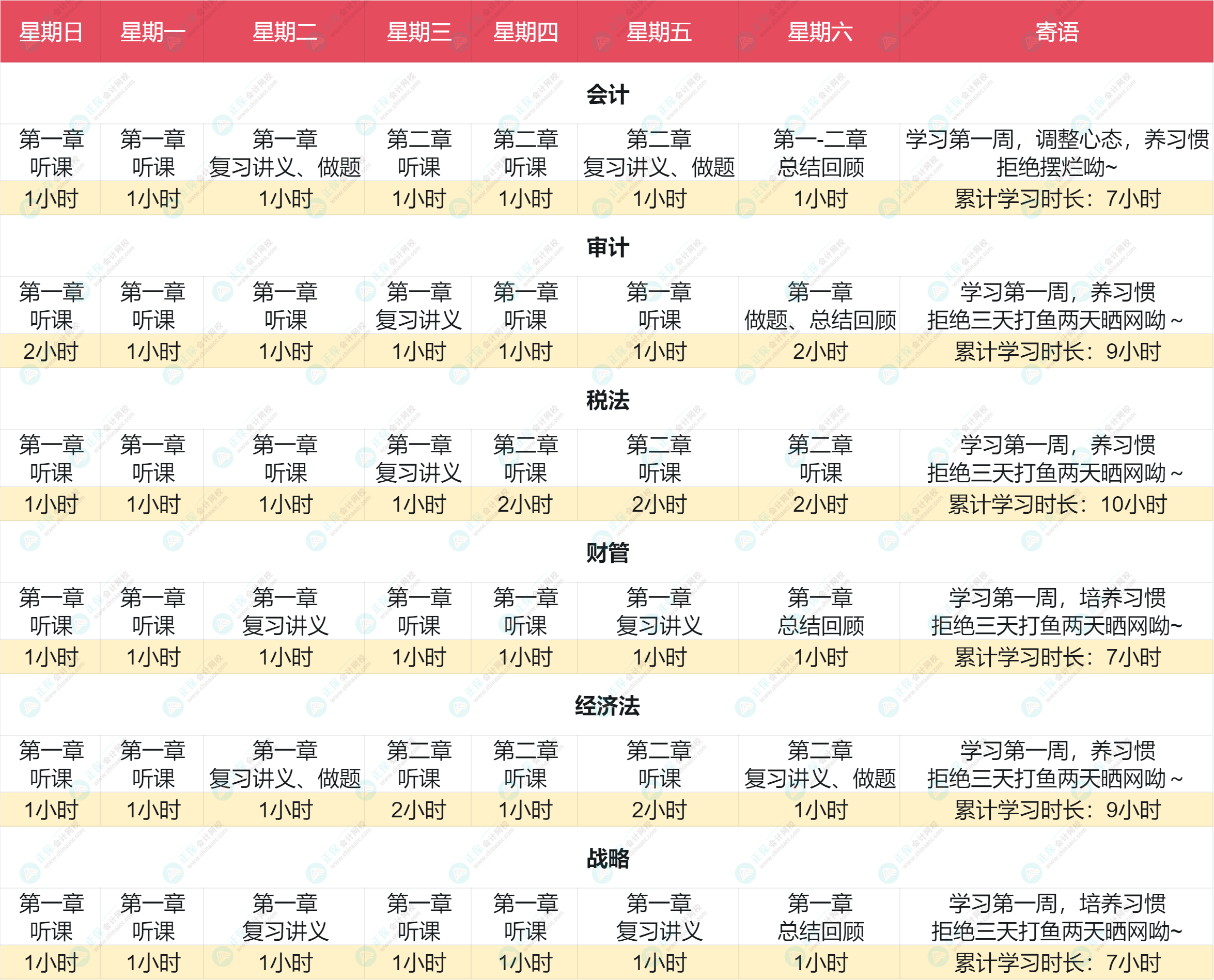 为了方便同学们对预习阶段备考进度进行整体把握,正保会计网校教学老师,整理了预习阶段的每周学习安排,希望这份周计划表对大家顺利通过2025年的考试有所帮助。