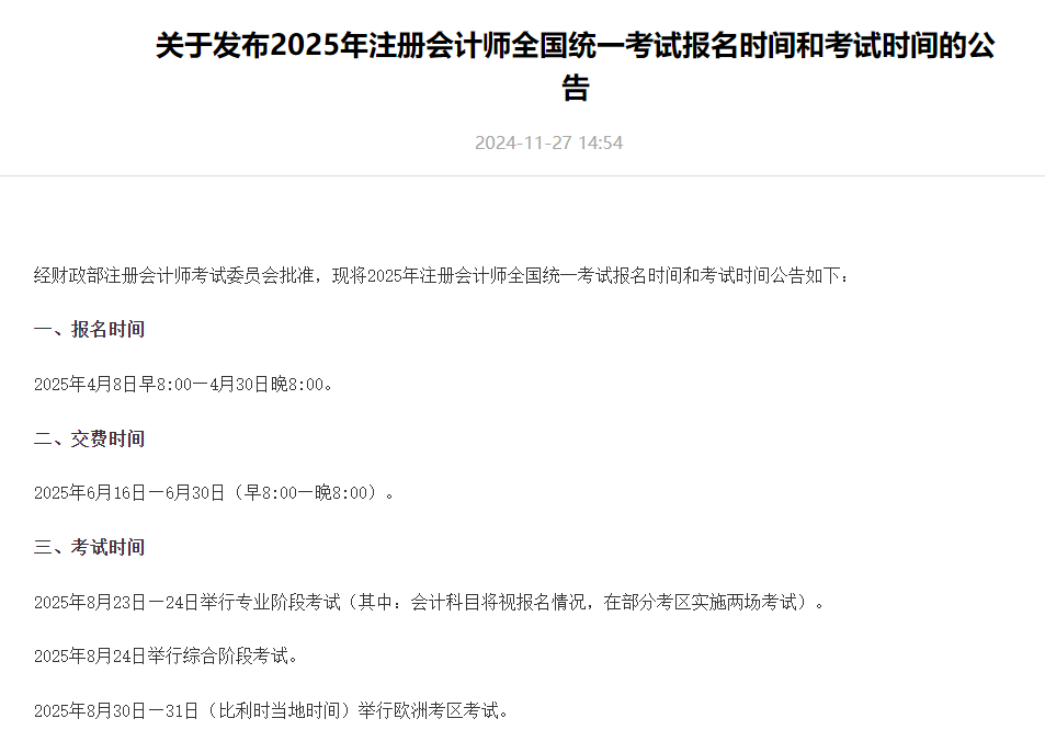 2024年11月份中注协发布了2025年CPA报名及考试安排的公告: