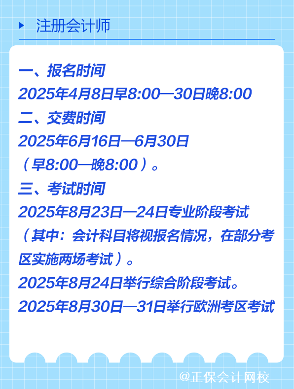 2025年注会4月8日-30日期间报名,考试安排在8月23日-24日,想要参加2025年考试的小伙伴们,要尽早开始备考哦。早一点备考,后面冲刺的时间就越充足!