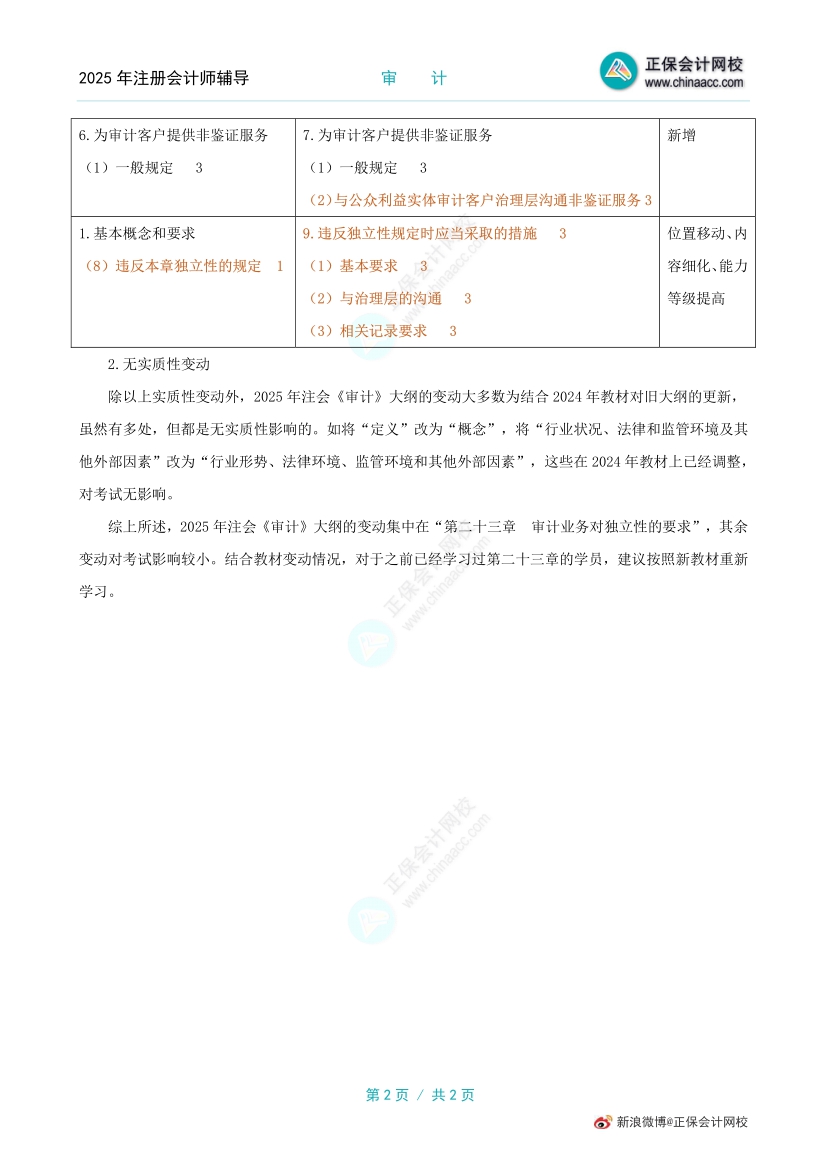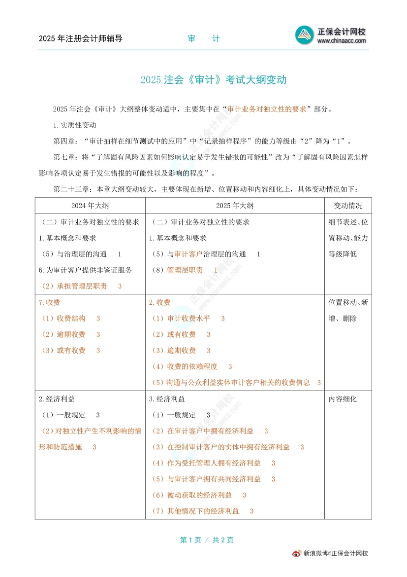 2025 年注册会计师考试大纲现已重磅公布(点击查看大纲 >)!不少考生都在关心,2025 年注会《审计》科目考试大纲和 2024 年相比,变化大不大呢?别着急!正保会计网校已经针对新旧注会考试大纲展开了全面且细致的对比分析,帮你快速梳理,轻松 get 变化要点,备考不迷茫 !