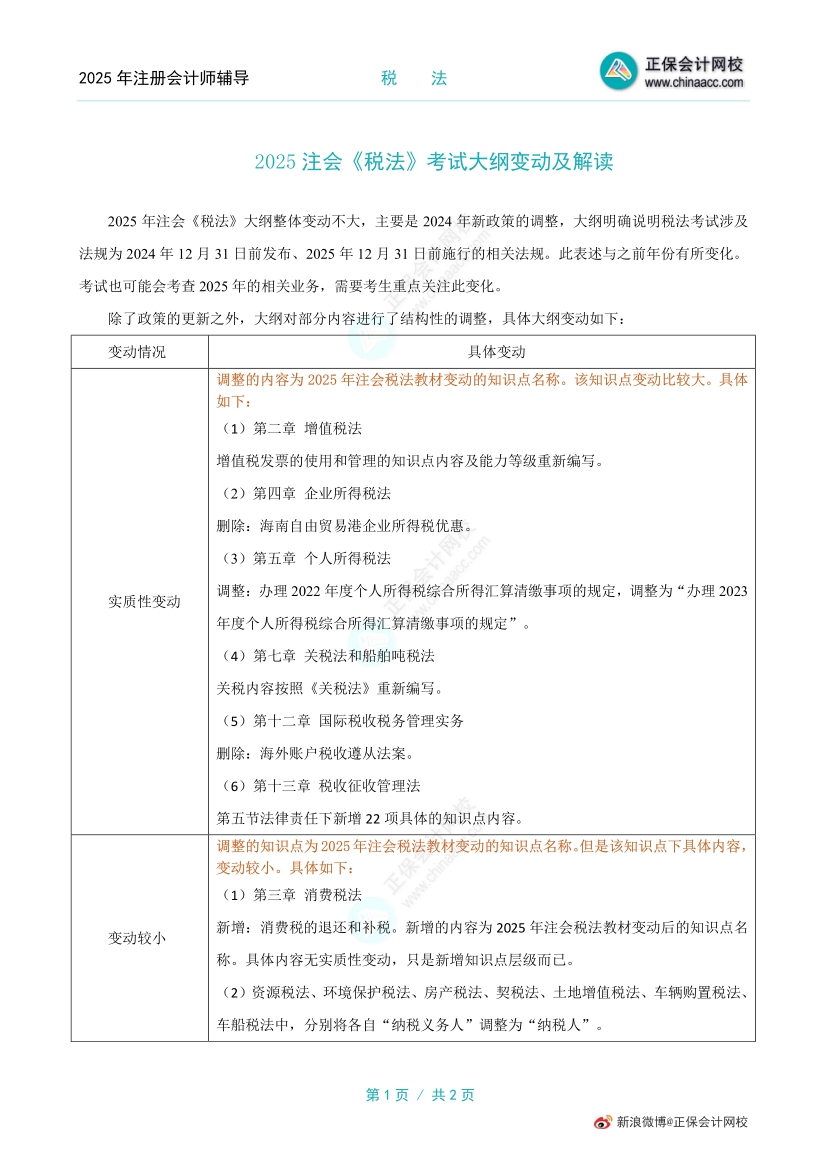 2025 年注册会计师考试大纲现已重磅公布(点击查看大纲 >)!不少考生都在关心,2025 年注会《税法》科目考试大纲和 2024 年相比,变化大不大呢?别着急!正保会计网校已经针对新旧注会考试大纲展开了全面且细致的对比分析,帮你快速梳理,轻松 get 变化要点,备考不迷茫 !