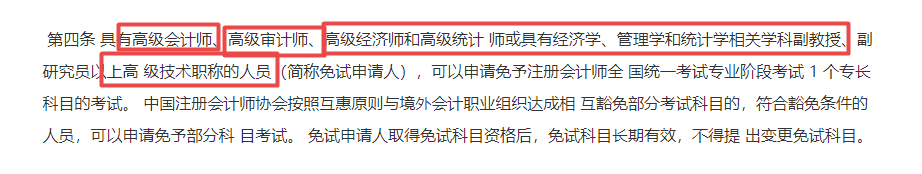 具有高级会计师、高级审计师、高级经济师和高级统计师或具有经济学、管理学和统计学相关学科副教授、副研究员以上高级技术职称的人员(简称免试申请人),可以申请免予注册会计师全国统一考试专业阶段考试1个专长科目的考试。