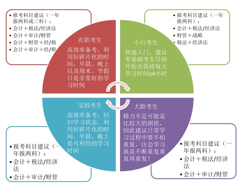 注册会计师报名进行中,不同备考人群科目如何选择呢?网校老师帮大家整理了比较全面的科目搭配,赶快来看下吧!