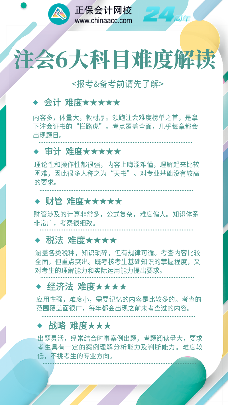 2024年注会考试报名4月8日起,你确定好报考科目了吗?是不是还在犹豫不知报哪些科目?网校小编特准备了注会6大科目难度解读,助你快速了解各科考情。