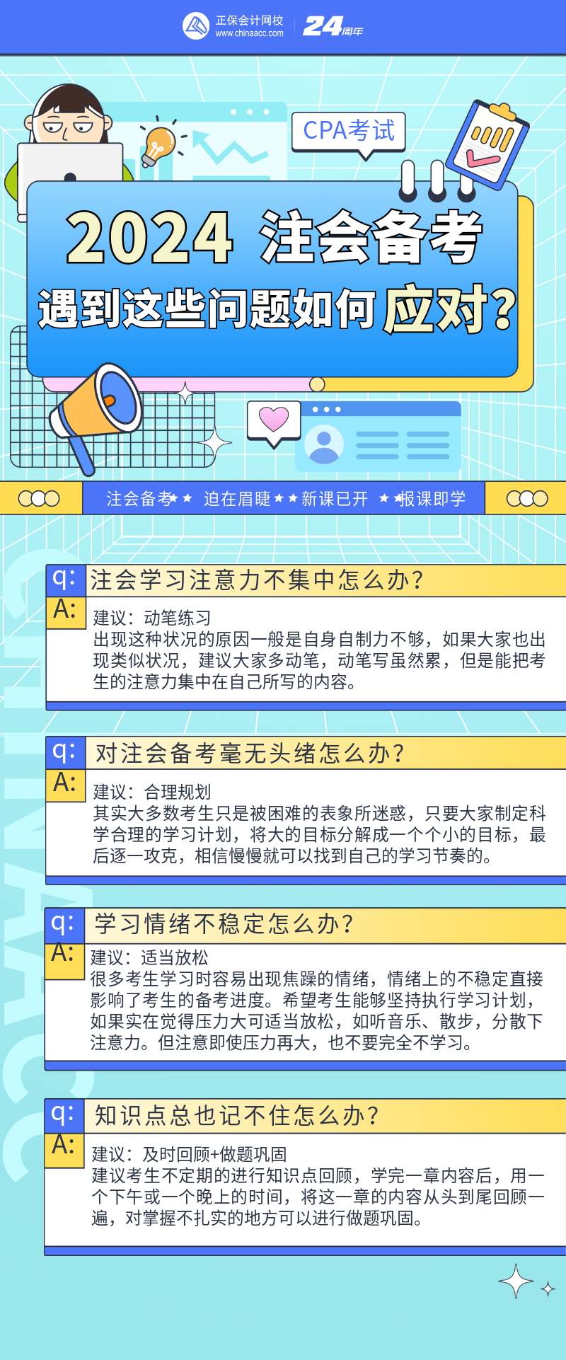 在2024年注册会计师考试备考过程中,你可能会遇到各种各样的问题,比如,学习注意力不集中、备考没头绪、情绪不稳定、知识点记不住……遇到这些问题时又该如何解决呢?快来看!