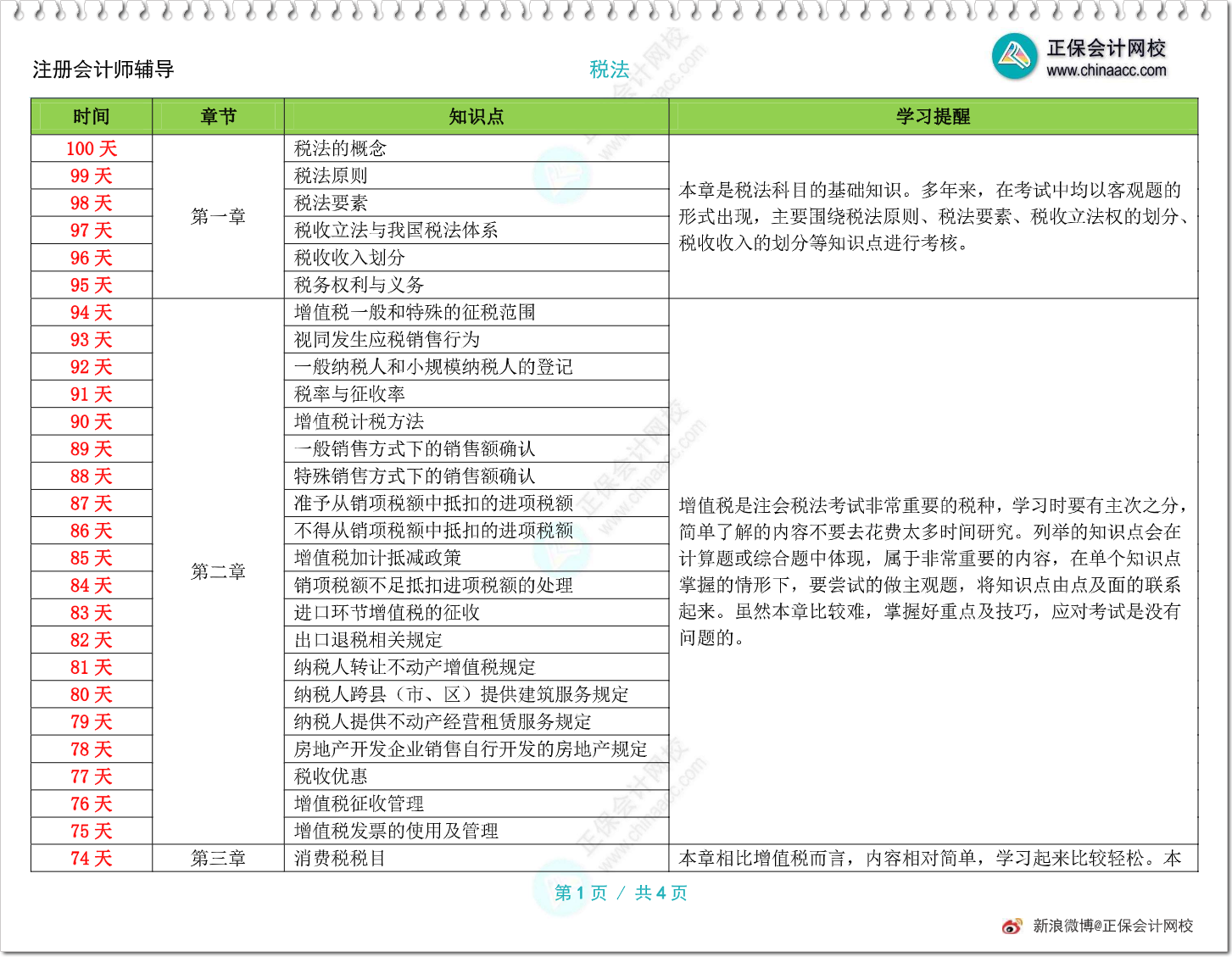 2024年注会《税法》百天学习计划表