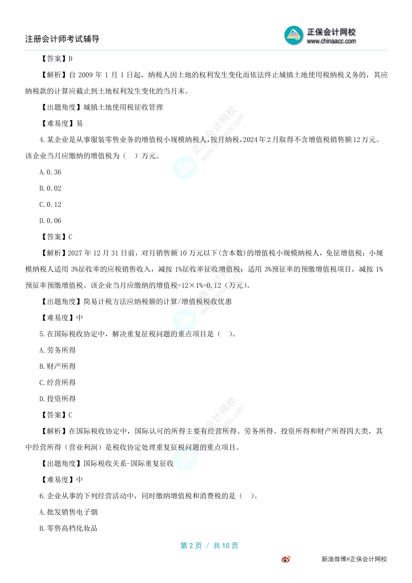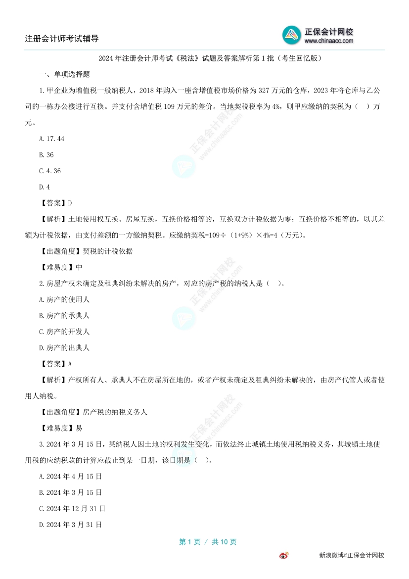 以下是2024注会《税法》考试试题及参考答案解析第一批(考生回忆版)部分内容: