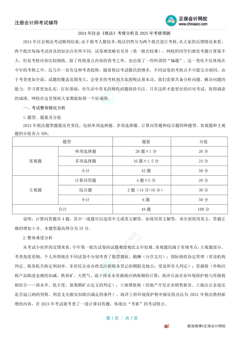 2024年注册会计师考试已结束,2025年新考季备考火热进行中,准备报考2025年CPA考试的小伙伴,正保会计网校教研团队为各位整理了一份备考资料——2024年注册会计师《税法》考试试题考情分析&2025年考试预测,助力备考,我们是用心的。