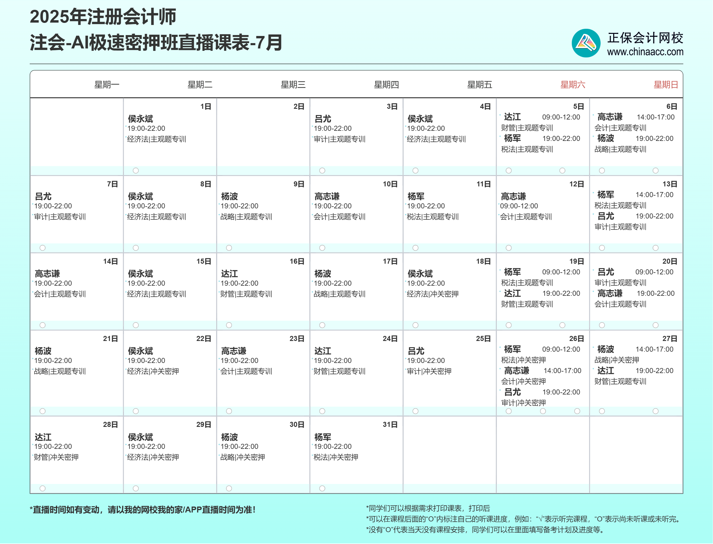 2025年注册会计师AI极速密押班7月直播课表安排来啦,各位注会小伙伴,跟紧老师们的上课进度,及时学习,备考效果更佳!