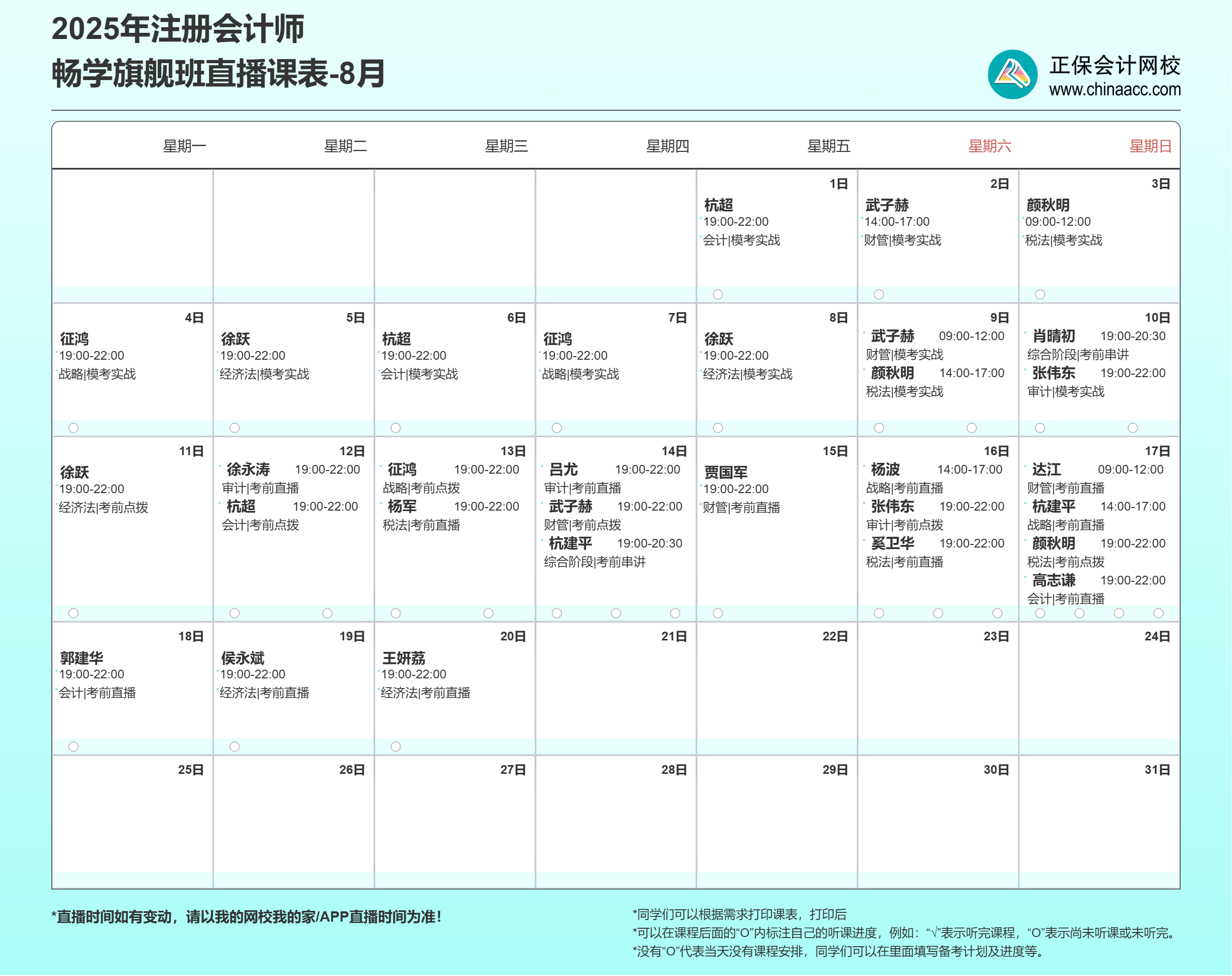距2025年注册会计师考试越来越近了,正是冲刺的好时机,你学的如何了?网校2025注会畅学旗舰班8月直播课表已经更新啦,快来Get课程安排,订好闹钟,按时听课学习哦~