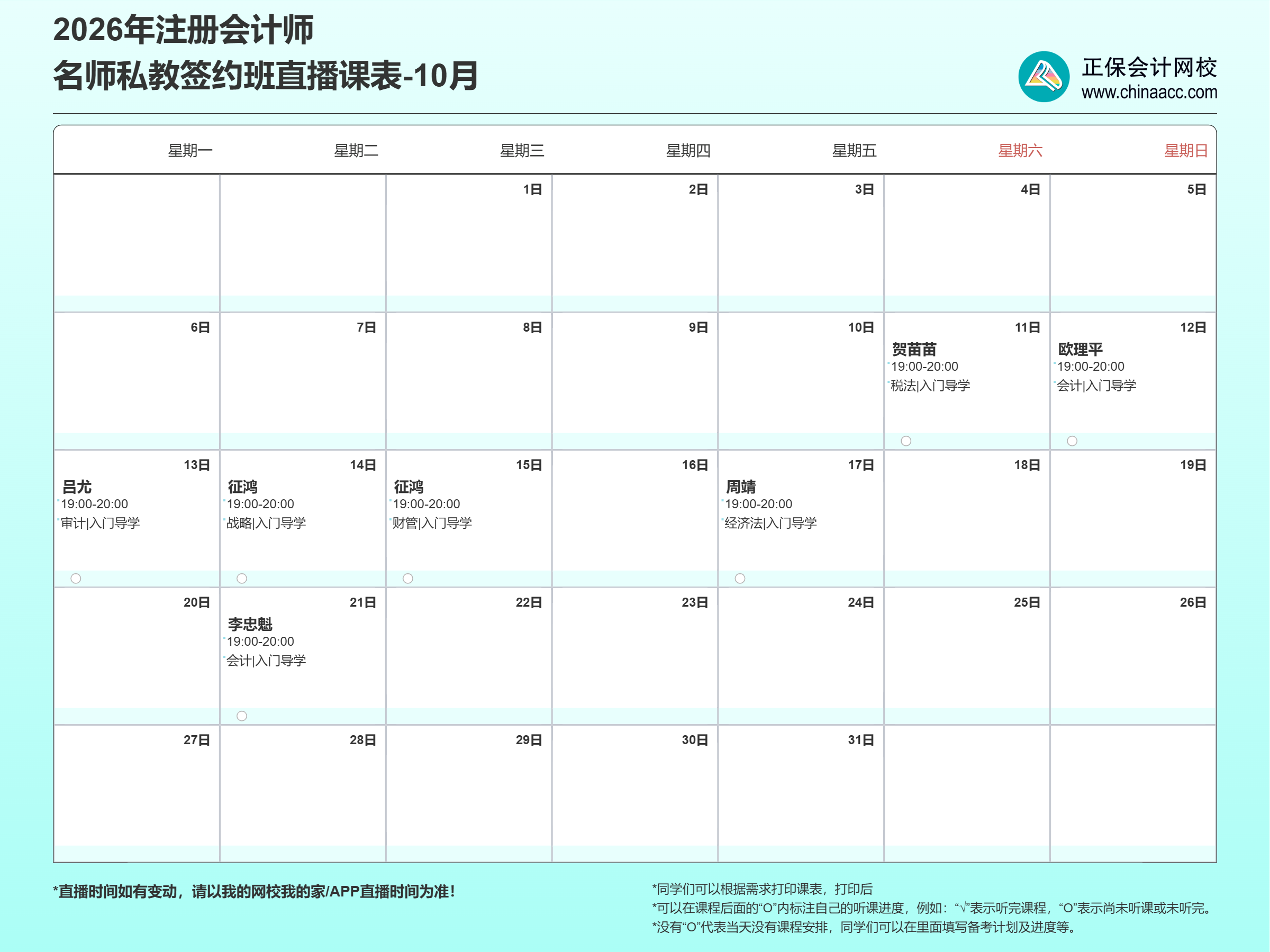 2026年注册会计师新考季已悄然开启,网校名师私教签约班全程陪伴,助你抢先一步,稳扎稳打赢在起跑线!10月直播课程安排新鲜出炉,速来查收并收藏!名师系统带学,精准规划学习路径,带你轻松高效入门。定好闹钟,按时上课,为2026年一战考过CPA打下坚实基础!