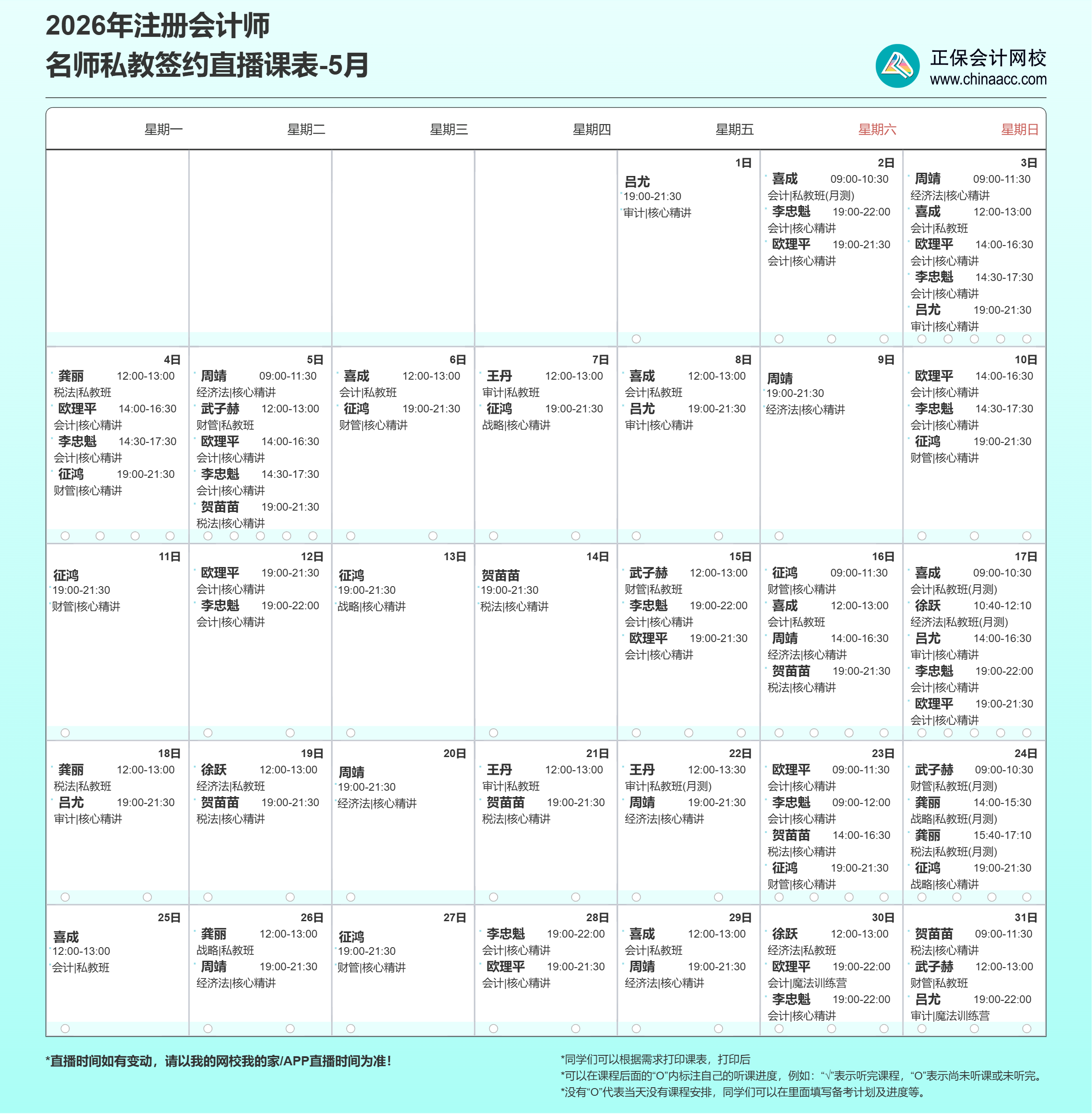 2026年注册会计师名师私教签约班5月直播课表已更新,速来查看!名师授课,1V1严管督学,保姆式伴学,助你轻松高效攻克注会!