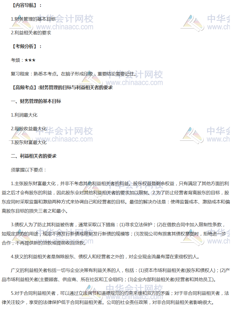备考时间紧张,抓紧时间抓住重点备考注册会计师吧!正保会计网校教学老师为广大考生整理了高频考点,我们一起来学习2018《财务成本管理》高频考点:财务管理的目标与利益相关者的要求。本考点属于《财务成本管理》第一章财务管理基本原理第二节财务管理的目标与利益相关者的要求的内容。