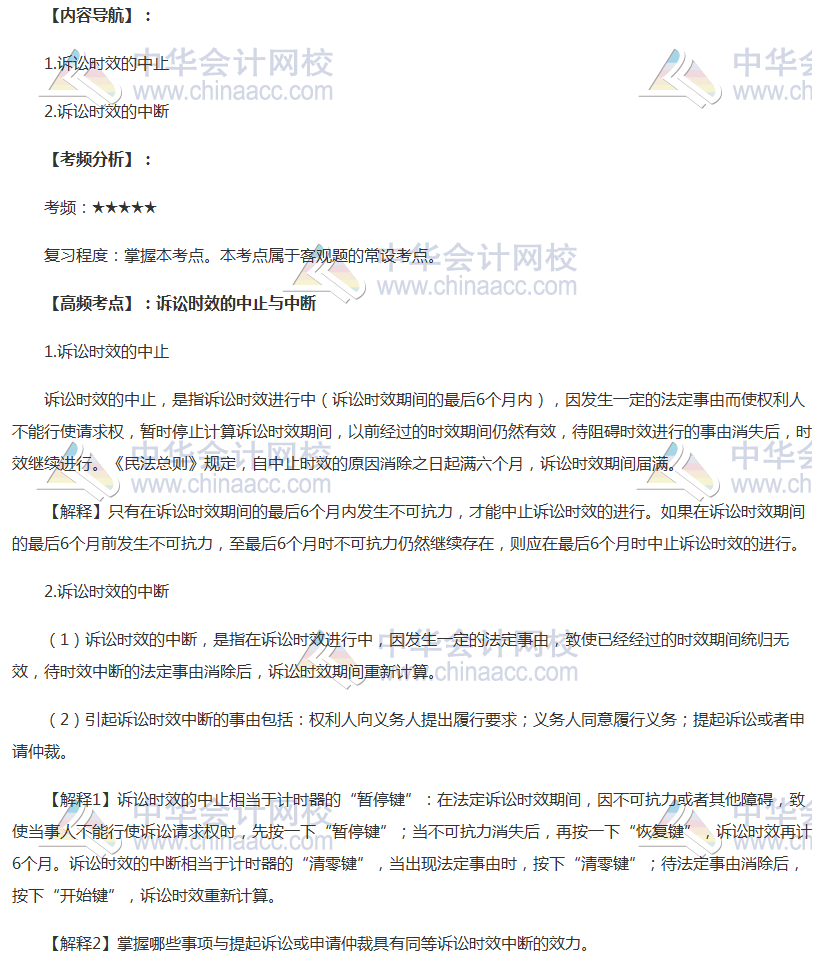 备考时间紧张,抓紧时间抓住重点备考注册会计师吧!正保会计网校教学老师为广大考生整理了高频考点,我们一起来学习2018年注册会计师《经济法》高频考点:诉讼时效的中止与中断。本考点属于注册会计师《经济法》第二章基本民事法律制度第三节诉讼时效制度的内容。