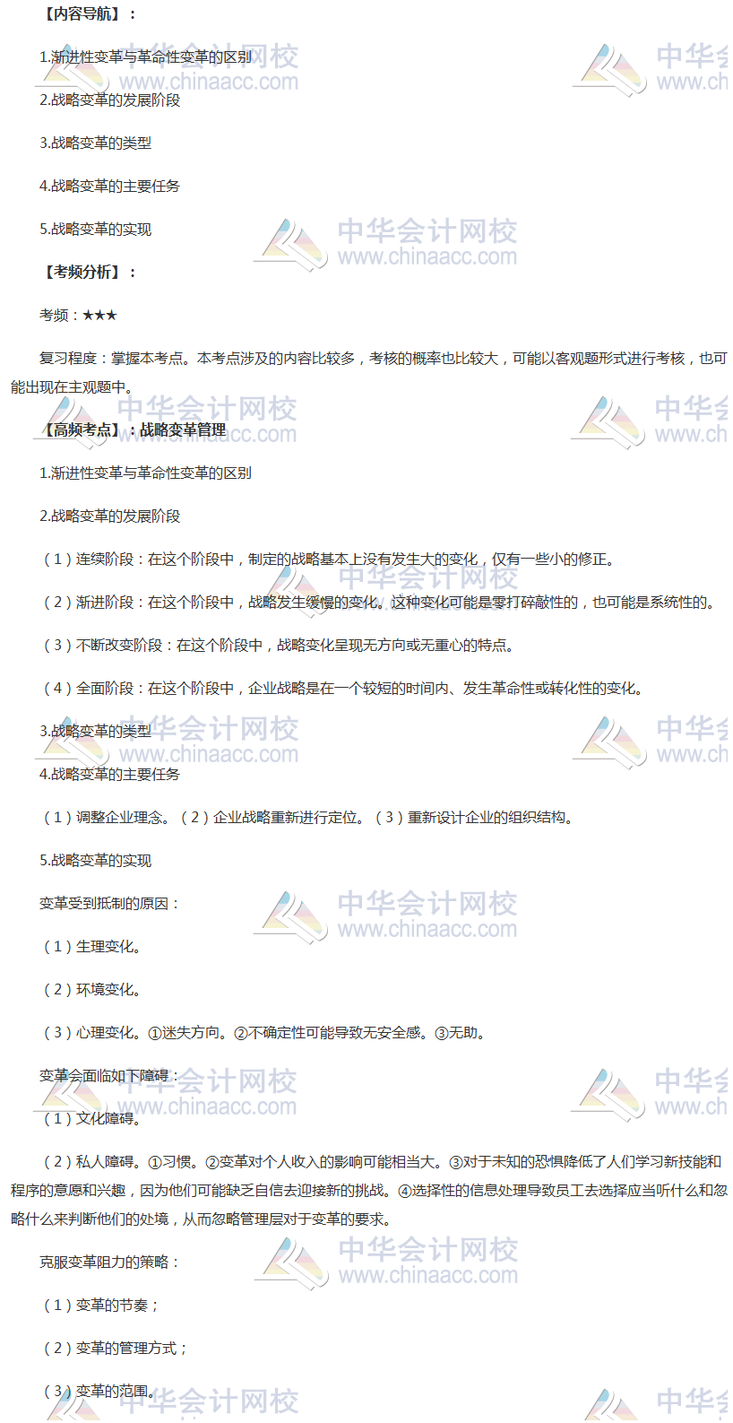 备考时间紧张,抓紧时间抓住重点备考注册会计师吧!正保会计网校教学老师为广大考生整理了高频考点,我们一起来学习2018年注册会计师《公司战略与风险管理》高频考点:战略变革管理。本考点属于注册会计师《公司战略与风险管理》第一章战略与战略管理第二节战略管理概述的内容。