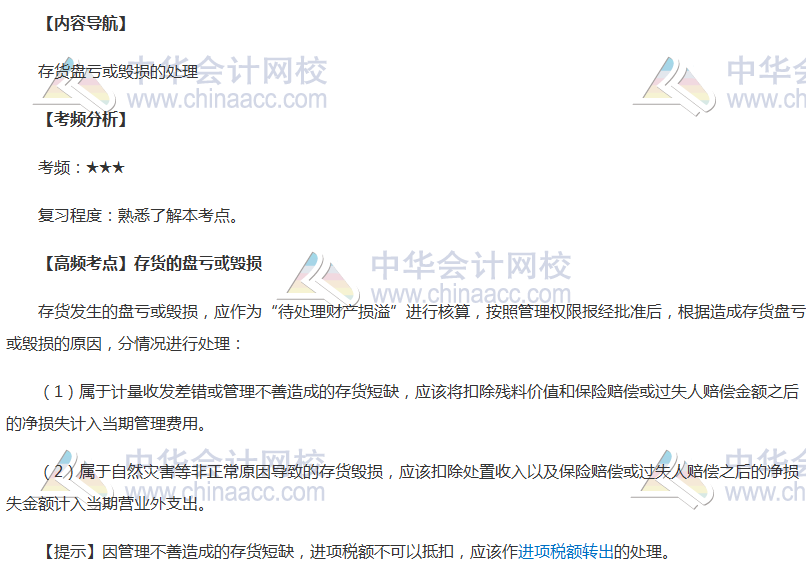 备考时间紧张,抓紧时间抓住重点备考注册会计师吧!正保会计网校教学老师为广大考生整理了高频考点, 我们一起来学习2018年注册会计师《会计》高频考点:存货的盘亏或毁损。本考点属于注册会计师《会计》第三章存货第四节存货的清查盘点的内容。