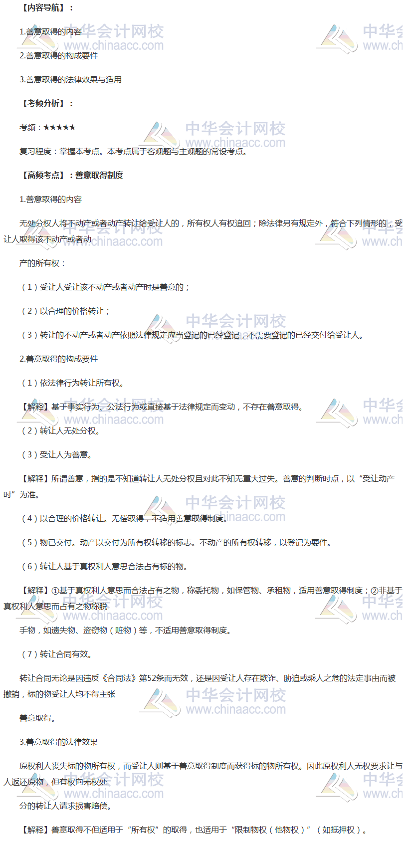 备考时间紧张,抓紧时间抓住重点备考注册会计师吧!正保会计网校教学老师为广大考生整理了高频考点,我们一起来学习2018年注册会计师《经济法》高频考点:善意取得制度。本考点属于注册会计师《经济法》第三章物权法律制度第三节所有权的内容。