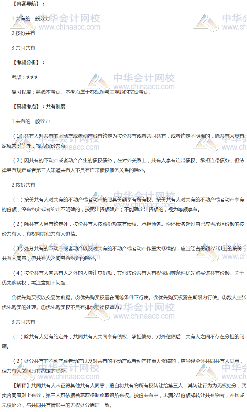 备考时间紧张,抓紧时间抓住重点备考注册会计师吧!正保会计网校教学老师为广大考生整理了高频考点,我们一起来学习2018年注册会计师《经济法》高频考点:共有制度。本考点属于注册会计师《经济法》第三章物权法律制度第三节所有权的内容。