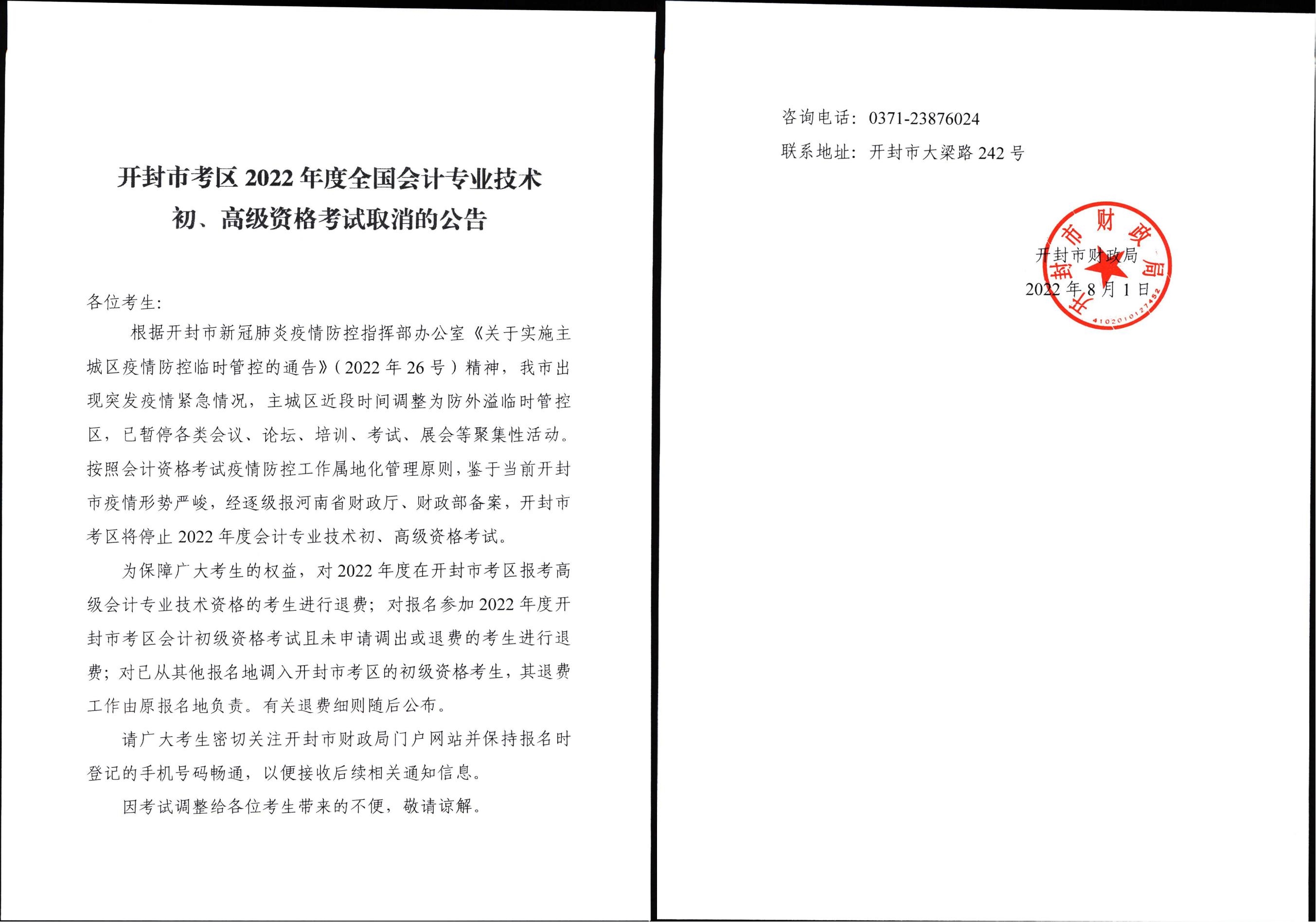 2022年,部分地区的初级会计考试取消,比如河南开封: