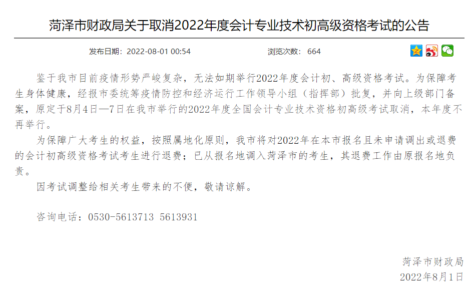 还有山东菏泽也宣布取消2022年初级会计考试: