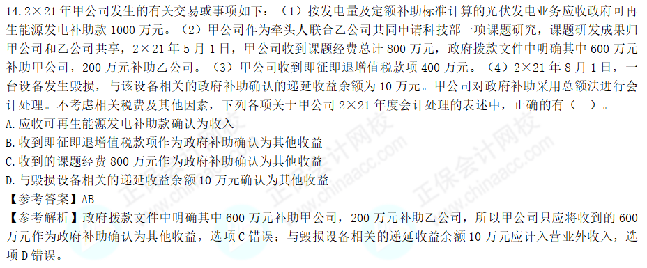 【点评】本题考查的知识点是“政府补助的确认与计量”。该题目所涉及知识点在下列正保会计网校(www.fawtography.com)2022年注册会计师考试辅导《会计》中均有体现:畅学旗舰/超值精品模拟试题(二)多选题第7题、模拟试题(三)多选题第2题。