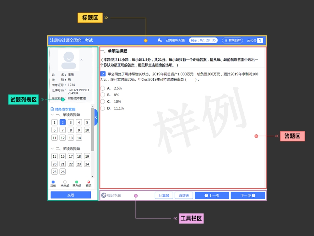 考生信息:此处显示考生入场时拍摄的照片及个人信息。在考试过程中,如考场监考人员、巡考人员需要核对个人信息,请考生予以配合。