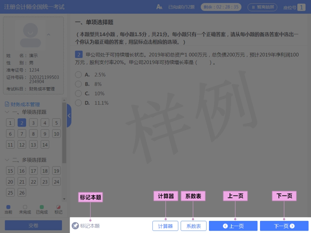 系数表:如考试科目提供了系数表供考生查阅,机考界面上会显示系数表按钮。考生可以通过点击系数表按钮,打开系数表页面查看。