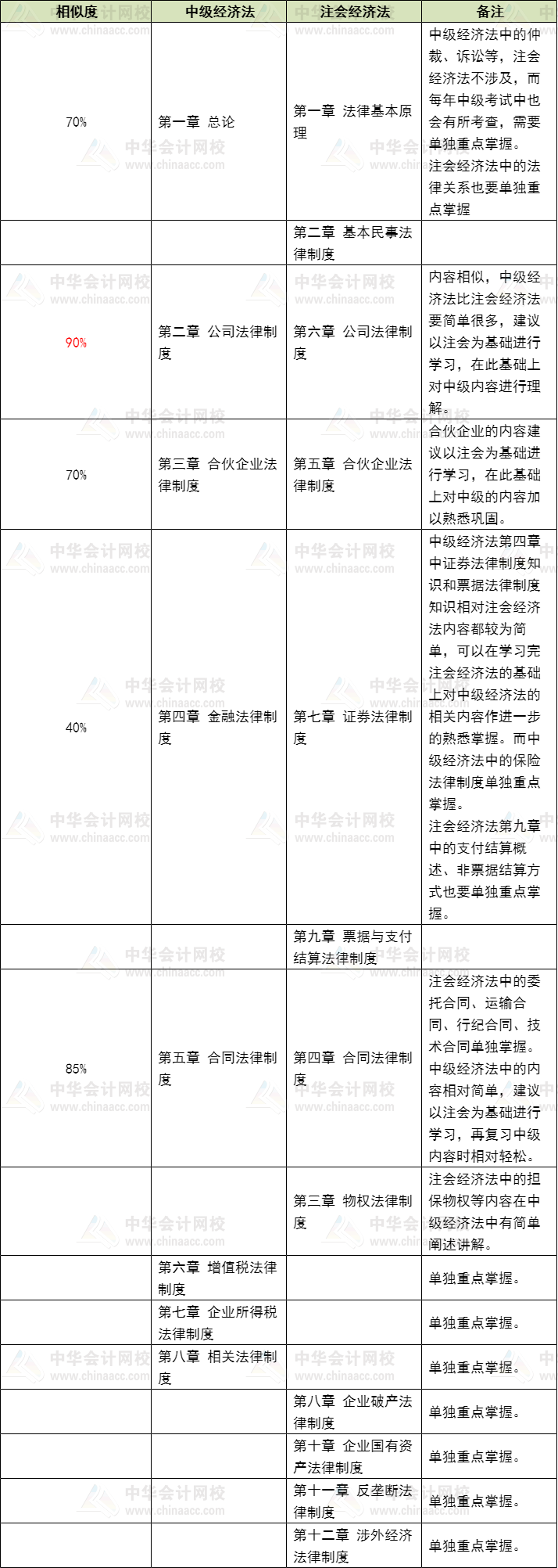 然后,从内容上来看一下注会的《经济法》与中级会计职称的《经济法》有哪些重合:
