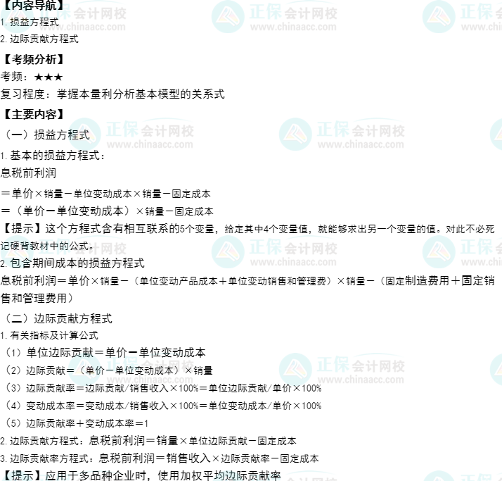 本章是重点章节,涉及到计算性的题目较多。从历年考试情况来看,各种题型都有可能出现,难度都不大,属于“送分题”。学习的时候抓住本量利的基本公式即可,大量的公式都可据此展开。主要考点包括各种成本特征、利润的计算方法、盈亏临界点、安全边际和敏感系数的计算等。