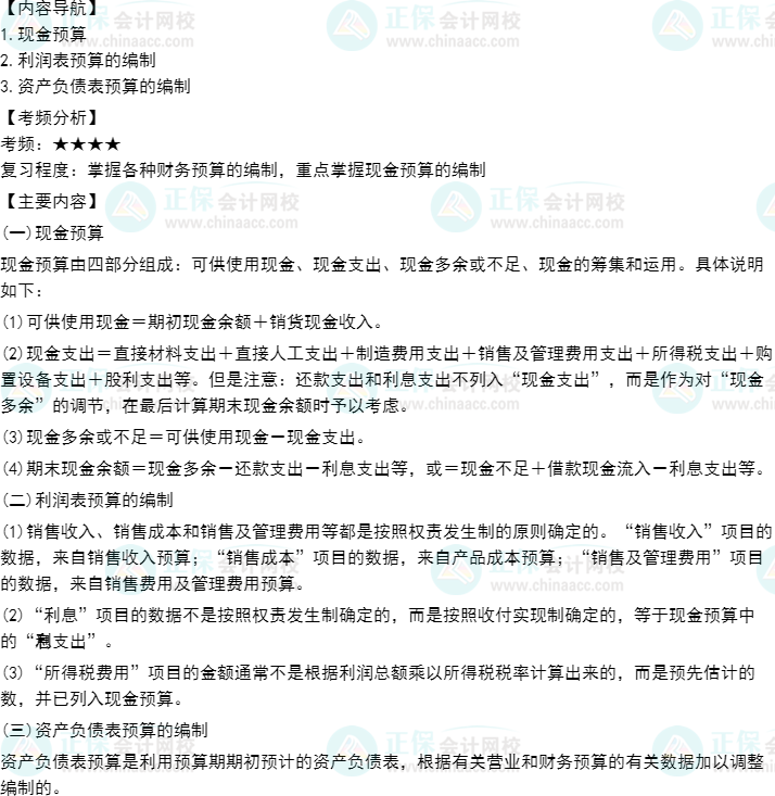 本章属于重点章节,学习难度不大,内容不多。从历年考试情况来看,本章各种题型都有可能出现,是全教材第三篇主观题考核章节之一。学习中要注意预算之间的逻辑关系,建立预算的整体体系。重要考点有预算编制的方法、销售预算、直接材料预算和现金预算的编制。