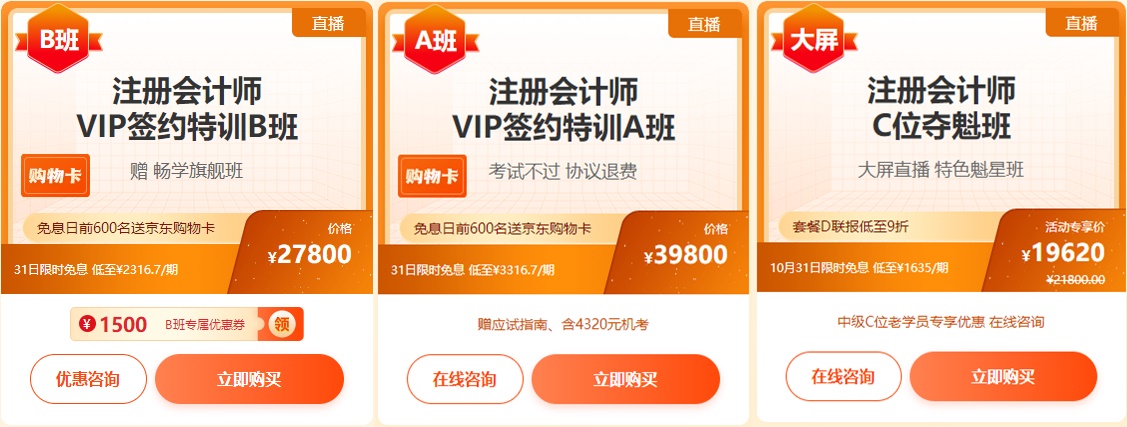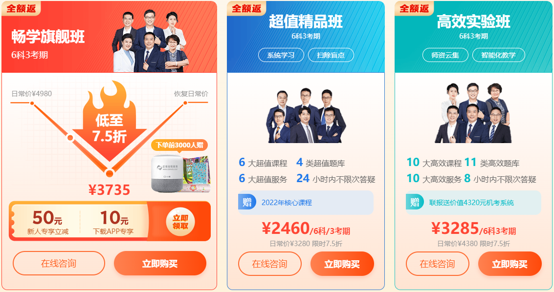 2、超值精品班、高效实验班、畅学旗舰班联报7.5折,单科8.5折,可以与新人券、正保币叠加使用。
