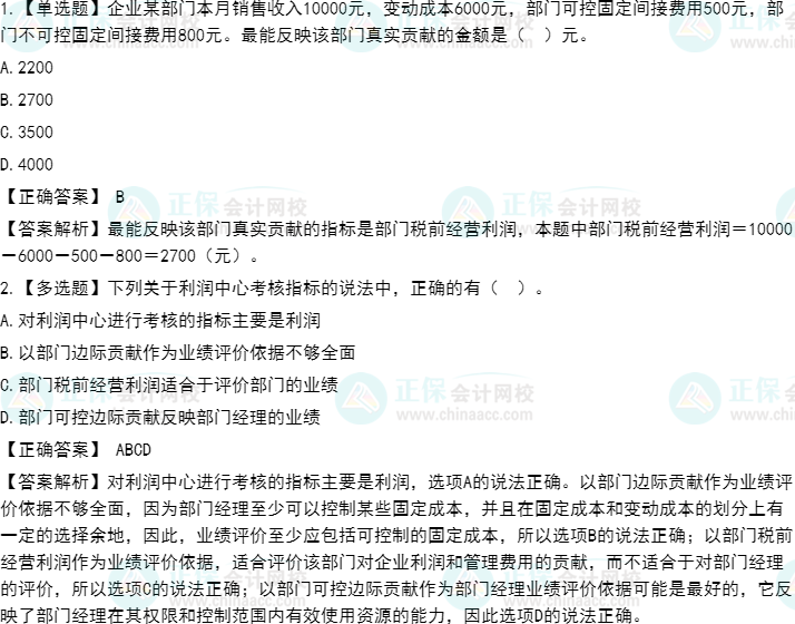 第十九章 责任会计 | 成本中心 利润中心 投资中心 | 注意掌握各种责任中心的考核指标的计算以及各自的优缺点。 |