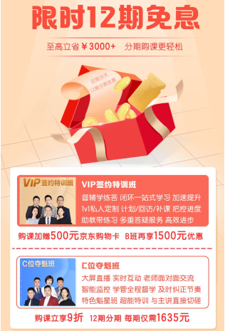 1、12月8日、12月12日高端班最高12期免息,VIP签约特训班加赠500元京东卡;