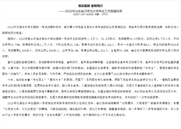 据统计,2022年度山东省注册会计师全国统一考试专业阶段报考11.5万人,30.2万科次,完成缴费18.8万科次,实际出考9.7万人次,平均出考率51.79%;取得单科合格2.1万人次,平均合格率22.10%。取得专业阶段合格2,224人,其中一次通过六科考试4人。