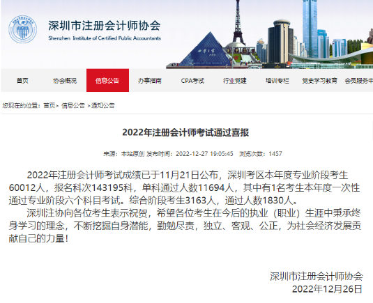 深圳考区2022年度专业阶段考生60012人,报名科次143195科,单科通过人数11694人,其中有1名考生2022年度一次性通过专业阶段六个科目考试。综合阶段考生3163人,通过人数1830人。