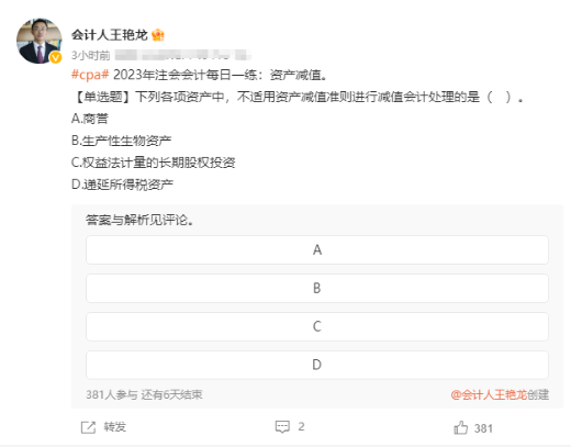 因为坚持,才会有破茧成蝶这样美好的故事。作为2023年注册会计师考试备考人,我们也想为自己争取一个完美的结局。王艳龙老师在微博里为大家整理了注会考试《会计》每日一练,赶紧跟上脚步学起来吧~