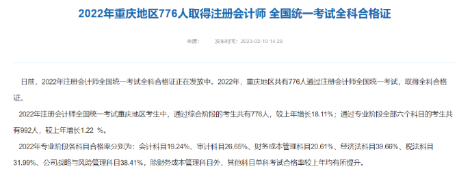 2022年注册会计师全国统一考试重庆地区考生中,通过综合阶段的考生共有776人,较上年增长18.11%;通过专业阶段全部六个科目的考生共有992人,较上年增长1.22 %。